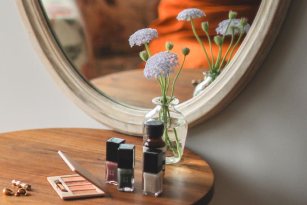 おうちの中に自然に似合うお花や装飾をして撮影します。